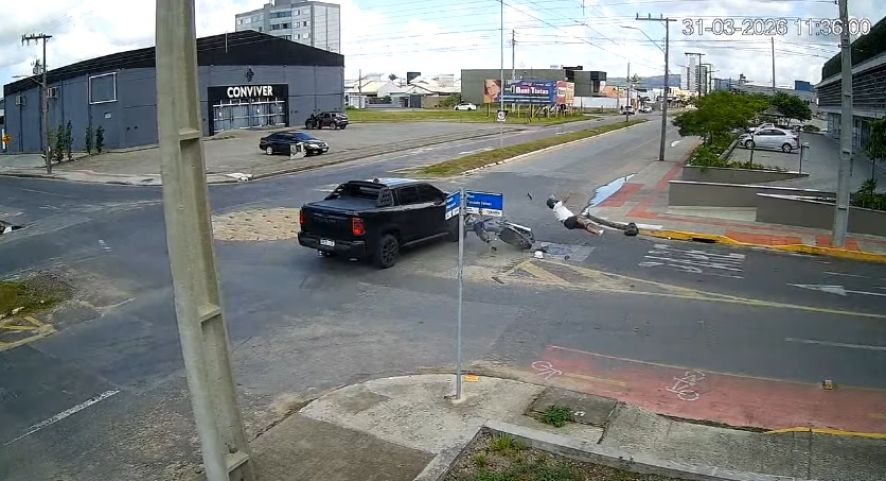 Imagens de câmeras de segurança mostram o momento em que a motocicleta se envolve na colisão com uma caminhonete. Com o impacto, o condutor da moto é lançado a alguns metros de distância, caindo violentamente contra o meio-fio.
