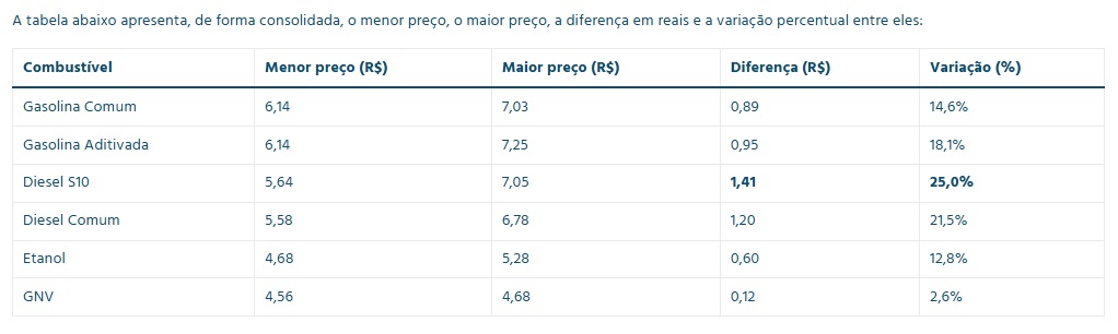Já o Diesel S10 registrou a maior oscilação: R$ 1,41 por litro (25,0%), com valores entre R$ 5,64 e R$ 7,05. Em um tanque de 50 litros, essa diferença pode significar um custo extra de R$ 70,50.