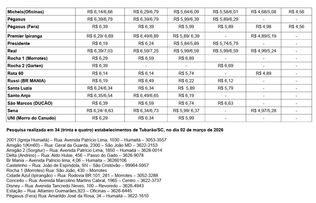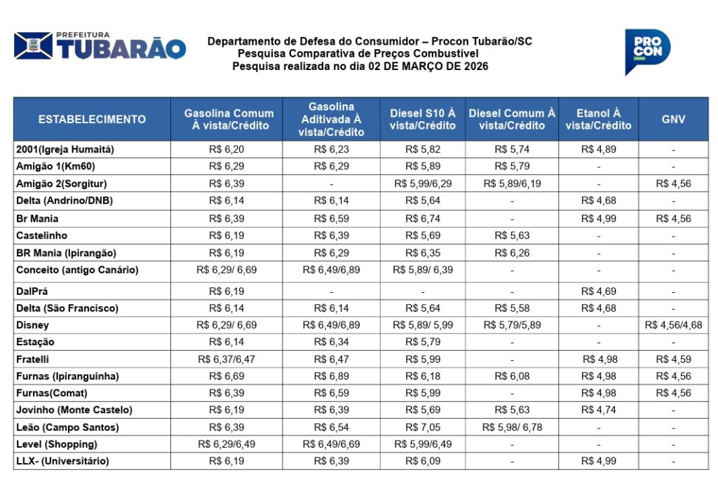 O Procon de Tubarão divulgou nesta segunda-feira (2) o resultado da pesquisa mensal de preços dos combustíveis realizada em 34 postos de Tubarão. O levantamento tem como objetivo ampliar a transparência do mercado e auxiliar o consumidor na busca por economia na hora de abastecer.