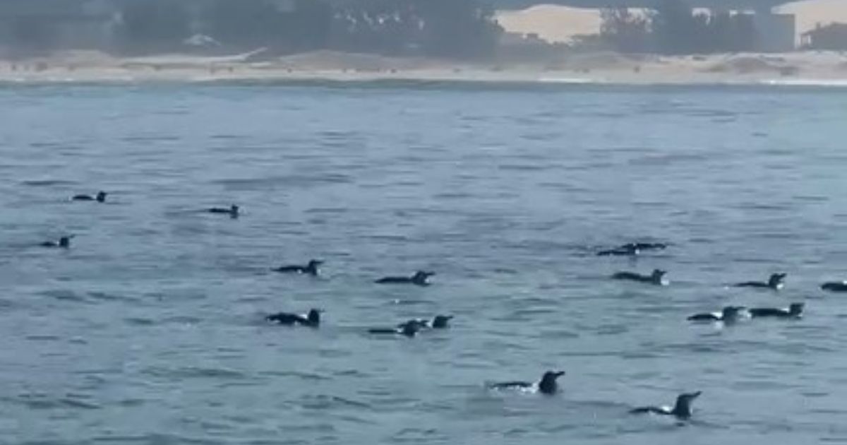 Grupo numeroso de pinguins-de-Magalhães é flagrado nadando em Morro dos Conventos e impressiona especialistas com rara concentração no local