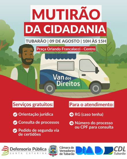 No próximo sábado, 9 de agosto de 2025, a Defensoria Pública do Estado de Santa Catarina promoverá mais uma edição do Mutirão da Cidadania em Tubarão. A ação acontece das 10h às 15h, na Praça Orlando Francalacci, localizada na Rua Lauro Müller, números 25 e 111, no Centro da cidade.